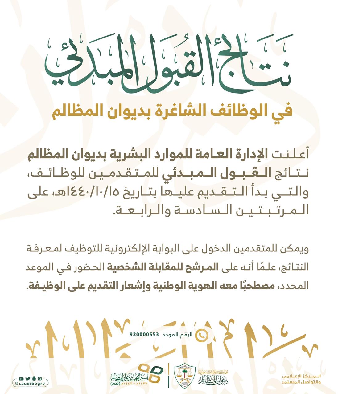 ديوان المظالم On Twitter ديوان المظالم يعلن نتائج القبول المبدئي للمتقدمين على وظائف المرتبتين السادسة والرابعة Https T Co 5wc7yq9xa4